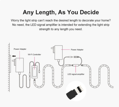 Jei jūsų LED juostos instaliacijos grandinė yra ilgesnė nei 5 metrai, tuomet jums reikalingas RGB/RGBW signalo stiprintuvas kas kiekvienus 5 metrus.