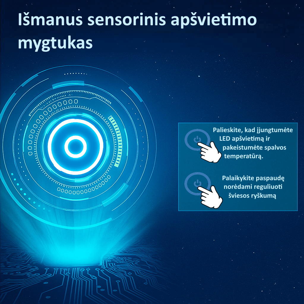 Sensorinis valdymas / reguliuojamas ryškumas – vienu prisilietimu įjungiama šviesa, taip pat palaikant mygtuką galima reguliuoti ryškumą.