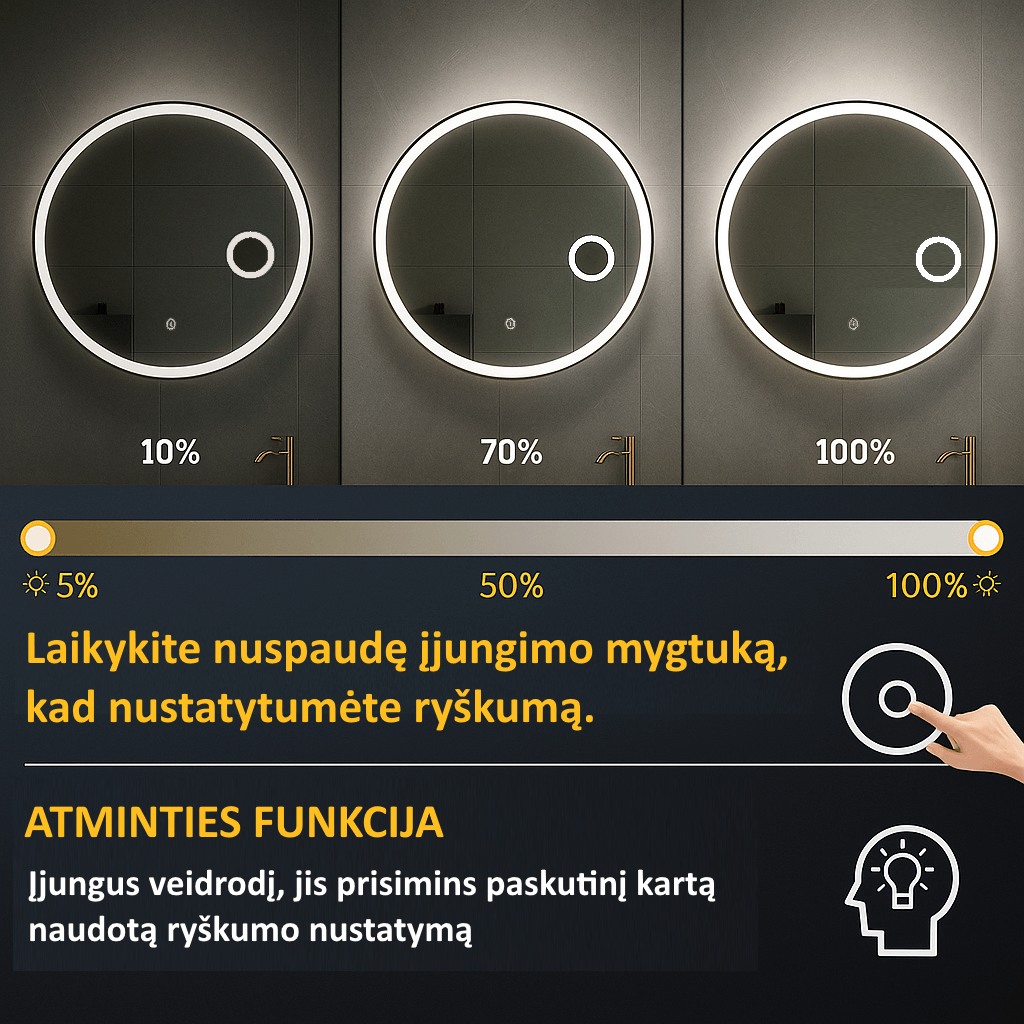 Sensorinis valdymas suteikia modernų ir patogų naudojimo būdą. Vienu prisilietimu įjungiamas apšvietimas, o palaikant mygtuką galima subalansuoti ryškumą pagal poreikį. Tai leidžia lengvai susikurti tiek ryškų darbiniam naudojimui tinkantį apšvietimą, tiek švelnesnę šviesą jaukesnei atmosferai. Dėl paprastos ir intuityvios valdymo sistemos veidrodis tampa patogiu pasirinkimu įvairioms erdvėms.