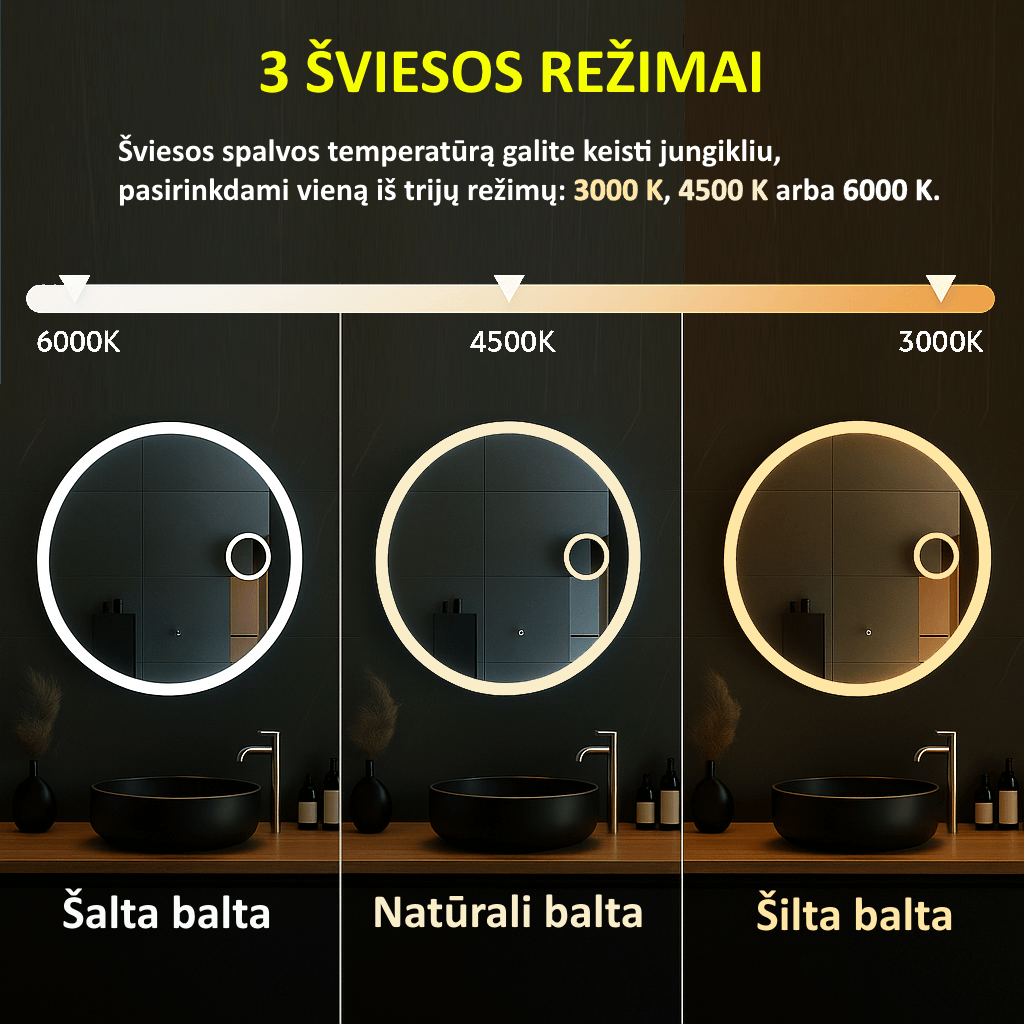 Trijų šviesos režimų pasirinkimas – galimi šviesos atspalviai: šiltai balta, natūrali balta ir šalta balta — leidžia pritaikyti apšvietimą pagal nuotaiką ar erdvę.