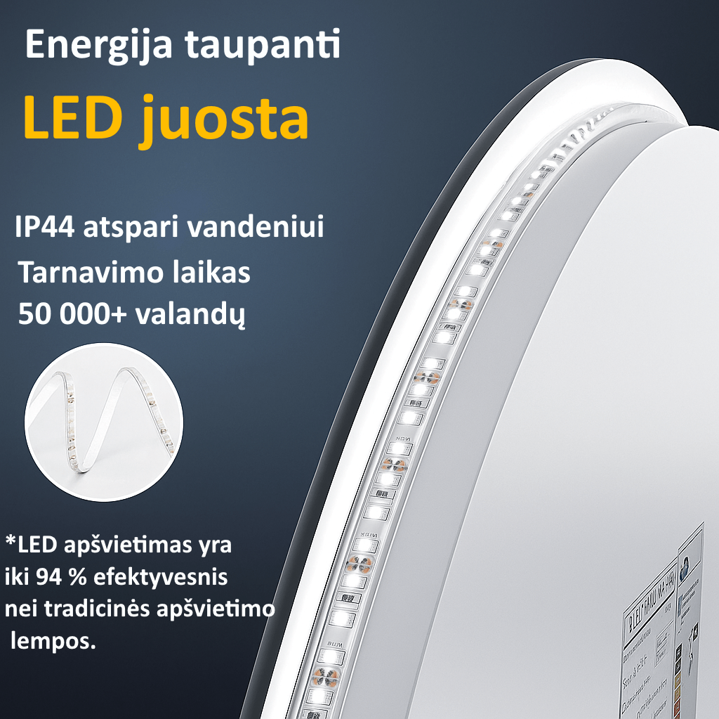 Integruotas LED apšvietimas aplink veidrodį – apšviečia veido zoną bei aplinką vienodai, be aštrių šešėlių.