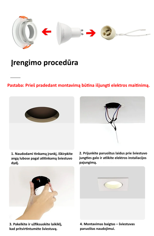 Kompatibilumas su LED lemputėmis – paprastai naudojama su GU10 arba MR16 (lemputė perkama atskirai).