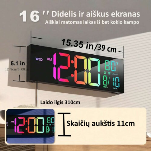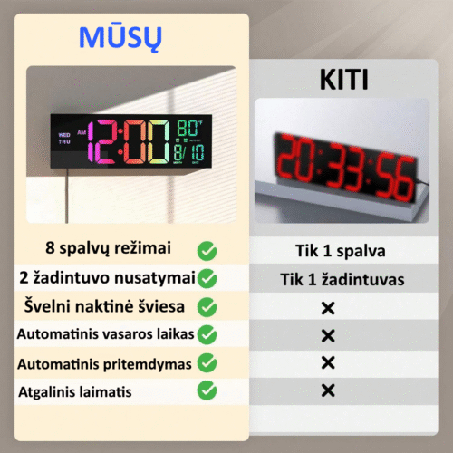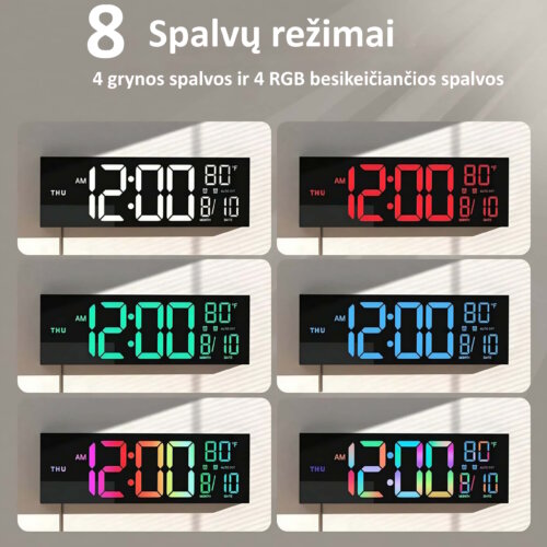 Išskirtinis privalumas – keturios vientisos spalvos ir RGB režimai. Galima pasirinkti baltą, mėlyną, raudoną arba žalią spalvą pagal interjerą ar nuotaiką. Jei norisi dinamikos, įjungiami spalvų perėjimo režimai, kai laikrodžio spalvos keičiasi automatiškai. Tai suteikia dekoratyvinio efekto ir modernumo bet kuriai erdvei.
